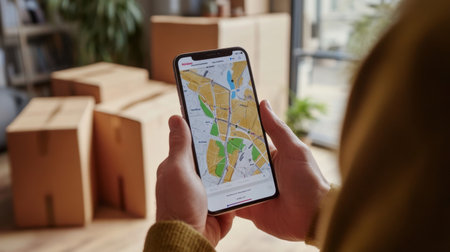 A close-up of a person using a smartphone to view a map application while in a minimalistic room filled with cardboard boxes, symbolizing the moving process.