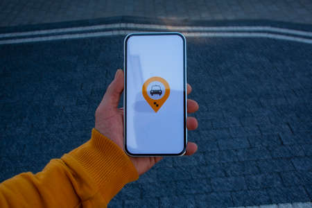 Man passenger in the parking lot holds a smartphone with a mobile application and calls a taxi online