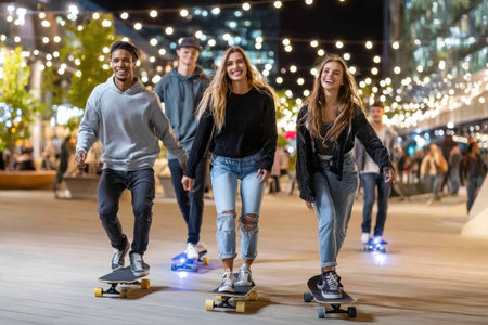 Group of friends skateboarding together in a vibrant plaza filled with decorative lights during evening.