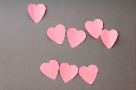 Red paper hearts on a pale pink background. Minimal concept.