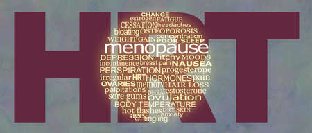 Menopause and HRT word bubble campaign background banner - circular word cloud relevant to menopausal awareness against a grey background and large HRT with copy space