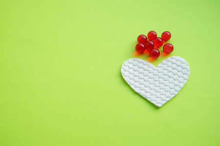 White fabric heart and round red capsules on a green table. Copy space