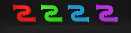 Colorful Industry metallic pipe icon isolated on black background. Plumbing pipeline parts of different shapes. Minimalism concept. 3D render illustration.