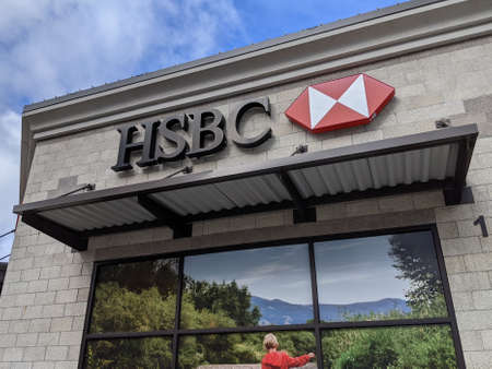 Redmond, WA USA - circa March 2021: Exterior view of an HSBC bank in downtown Redmond on a sunny day.