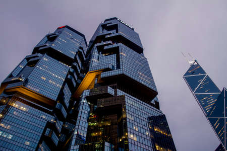 HONG KONG, CHINA - CIRCA JANUARY, 2019: low angle view of skyscrapers in Hong Kong.
