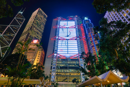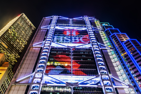 Hong Kong, Hong Kong - March 12, 2017: HSBC Main Building at night. Its a headquarters building of The Hongkong and Shanghai Banking Corporation designed by the British architect Norman, Lord Foster