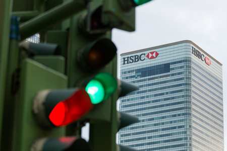 Traffic lights next to HSBC bank in Canary Wharf business district, London in 19th of May 2017