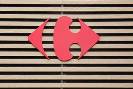 Anse, France - October 11, 2020: Carrefour sign on a wall. Carrefour is a french multinational retailer headquartered in France and it is one of the largest hypermarket chains in the world