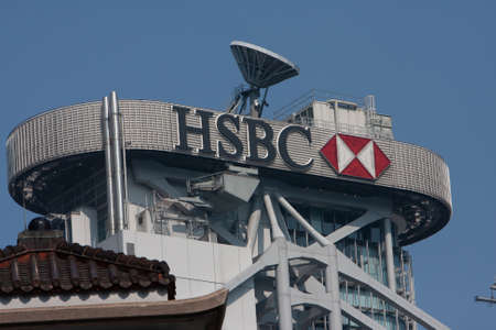 Hong Kong - October 13 2014: HSBC sign in the headquarters building of The Hongkong and Shanghai Banking Corporation in Central on October 13 2014. HSBC holding is the main bank in Hong Kong