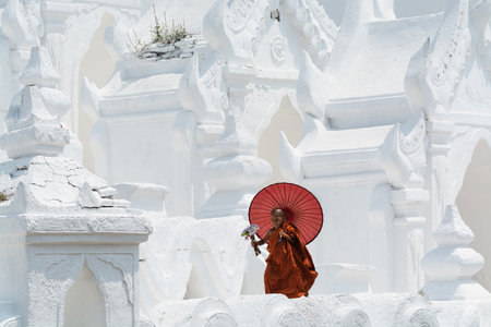Mandalay, Myanmar - April 2019: Buddhist novice monk in orange robe with red umbrella jumping on the walls of Myatheindan Pagoda.