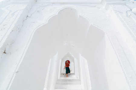 Blonde Caucasian woman with red umbrella walking on the terraces of Myatheindan Pagoda in Mandalay, Myanmar