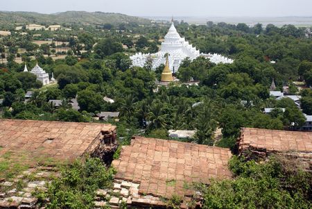 Myanmar, Mingun: blue sky and green vegetation for this image of a white pagoda