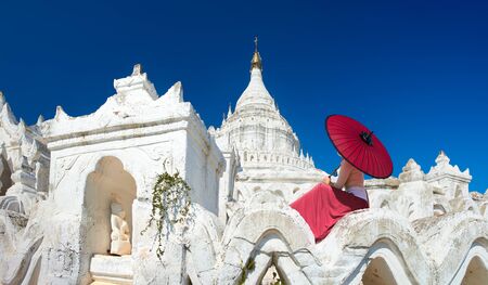 Young woman with traditional Burmese umbrella looks at ancient pagoda Hsinbyume-Paya, Myanmar.