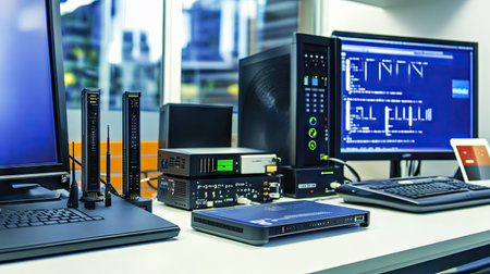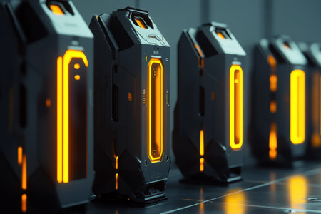 Advanced illuminated devices are neatly arranged in a high-tech space, highlighting design innovation.