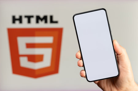New York, USA - November 15, 2023: HTML5 platform for creating mobile app for smartphone with blank screen in background