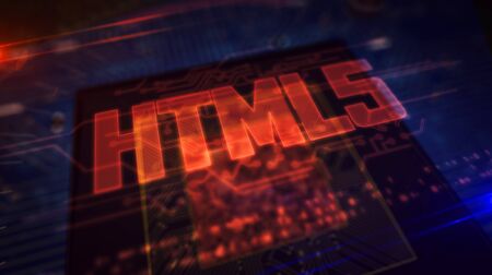 HTML5 glowing hologram over working cpu in background. Modern and futuristic concept of coding, software and programming 3d illustration.