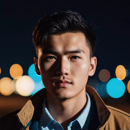 A young man with a confident expression poses against a backdrop of colorful lights at night in urban setting. A resident of Kazakhstan, a cute man of 25 years old. Student or applicant. AI generated.
