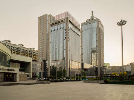 Guilin, China - May 10, 2010: Downtown Central Square. Portrait of Modern gray office building with blue glass walls under silver sky. Pyramids in glass, people and park square.