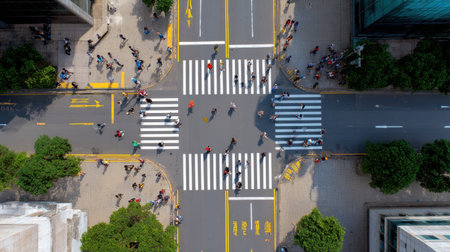 A lively urban scene showcases pedestrians navigating a busy crosswalk in a bustling city.