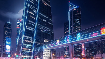 Night starry sky above Shanghai Skyscrapers. reflection of Shanghais skyscrapers amidst bustling urban life at evening.