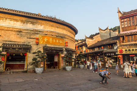 FENGHUANG, CHINA - AUGUST 13, 2018: Cobbled pedestrian street in Fenghuang Ancient Town, Hunan province, China