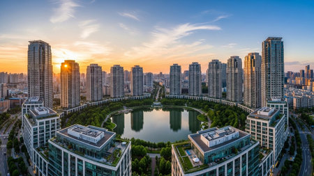 A wide aerial panorama of a modern city at sunset, featuring a central lake surrounded by numerous high-rise...