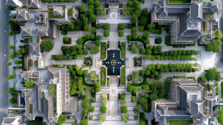 This stunning aerial image captures a lush green garden interwoven with modern architecture, showcasing symmetrical pathways and tranquil water features.