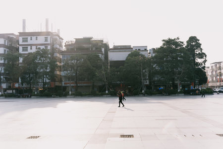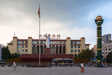 Chengdu, China - August 15, 2015 -Tourists at Tianfu Square in front of the statue of Chairman Mao and the Sichuan Science and Technology Museum in Chengdu, Sichuan Province, China.