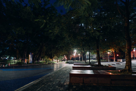 Nighttime urban park scene with illuminated pathways, tree-lined walkway, empty benches, and streetlights casting soft glow