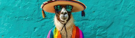 Llama in a sombrero and colorful poncho, sporting sunglasses, vibrant celebration theme, turquoise background.