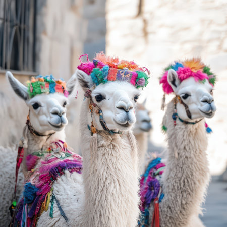 Three llamas adorned with vibrant decorations stand together in a lively setting. The colors reflect the festive atmosphere of the occasion.