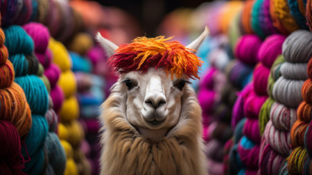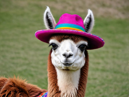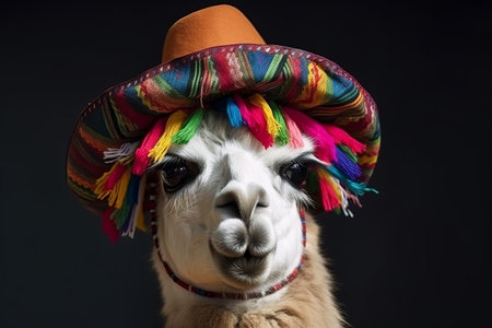 A portrait of a Llama wearing a colourful traditional hat. Generative ai