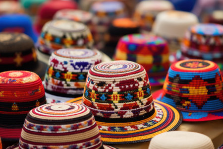 Festive Peru colorful decorated hats. Brightly multicolored ceremonial festive headwear. Generate ai