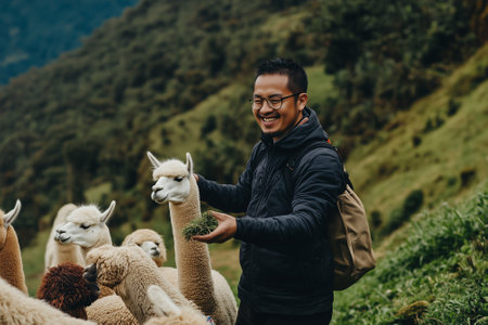 Friendly alpaca farmer feeding alpacas on green hillside, smiling as they gather around with lush scenery behind. Generative AI