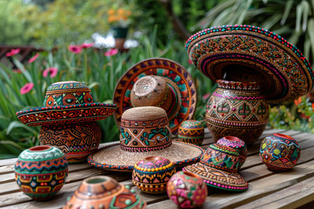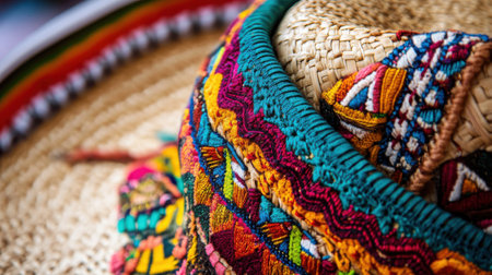 A beautifully crafted sombrero sits alongside a traditional hat, both showing intricate patterns and vibrant colors in a bright, cultural setting, inviting admiration.