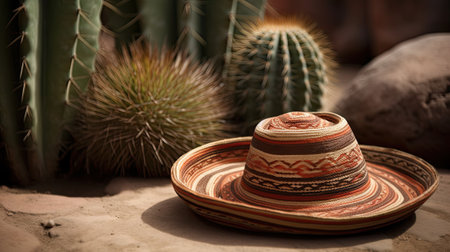 Mexican sombrero and cactus in desert, ai generative