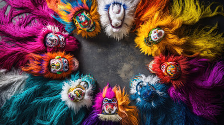 A stunning arrangement of colorful traditional masks with vibrant fur, showcasing the rich cultural heritage and artistic creativity in a circular formation.