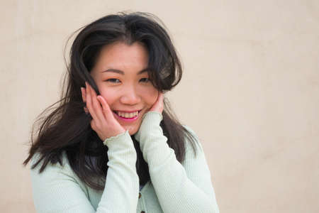 natural portrait of young happy and beautiful Asian Korean woman smiling cheerful posing playful bringing positive vibes outdoors on isolated background