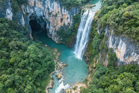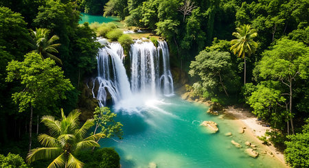 An aerial perspective showcases a vibrant waterfall plunging into a turquoise pool, surrounded by dense greenery. The image features a composition of water, trees, and distant mountains. It exhibits rich colors, natural textures, and bright lighting. Suitable for environmental themes or travel publications.