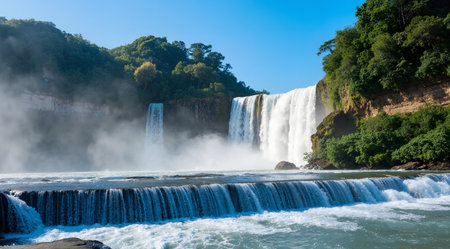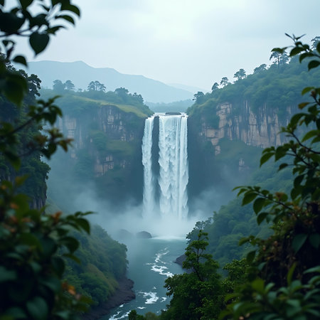 Majestic waterfall plunges powerfully down steep cliffs, surrounded by dense green foliage and hazy atmosphere Great for nature and travel backgrounds.