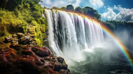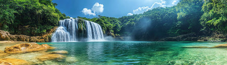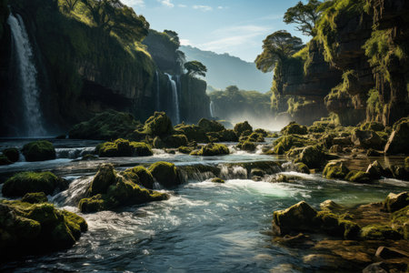 An exceptional image suitable for travel brochures, nature documentaries, or environmental awareness campaigns | The photograph presents an awe-inspiring view of a robust waterfall, its powerful torrents cascading over a verdant, moss-covered cliff face into an aquamarine pool below. The sun's rays penetrate the mist-laden air to bathe the scene in a warm, ethereal light that enhances the dynamic interplay between the elements. The vibrant greens of the surrounding foliage convey the essence of unspoiled nature, undisturbed by the modern world, symbolizing purity and vitality. The sheer volume and force of the waterfall are palpable, with the water's frothy tendrils creating a soothing white noise that one can almost hear through the image. A sense of serenity envelops the viewer, inviting contemplation and admiration for the raw power and beauty of nature. This visual narrative celebrates the planet's natural wonders and the importance of preserving such exquisite environments | Ideal for environmental conservation messages, promoting eco-tourism, or simply as a breathtaking backdrop in any setting that values nature's grandeur. The photograph can also serve as an impactful focal point in educational material about hydrological cycles and geological formations, or as a stunning piece of wall art for those who are drawn to the magnificence of the natural world | a stunning landscape showcasing a waterfall in full flow, with sunbeams creating a magical atmosphere, perfectly capturing the serene yet dynamic essence of nature, complete with ample space for overlaying inspirational quotes or informational content