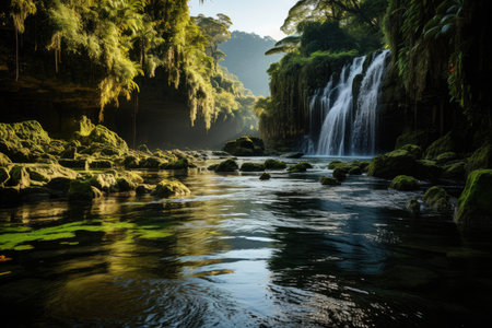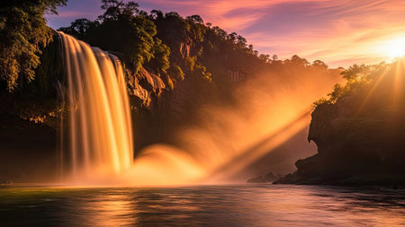 A stunning waterfall dominates the landscape, with water flowing into a river. The scene is bathed in warm sunlight, creating a golden glow. The composition showcases the natural beauty of the environment. Suitable for a range of commercial uses including travel, nature, and scenic content.