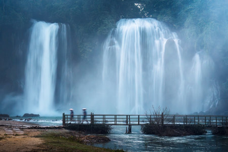 Majestic Ban Gioc Waterfall flowing with villager walking on wooden bridge in the dusk at Cao Bang, Vietnam