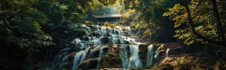 A stunning image of a large, cascading waterfall rushing down rocky terrain through a dense, lush forest. The waterfall is framed by towering trees and lush vegetation, and a traditional wooden structure, likely a temple or shrine, sits nestled in the foliage. Sunlight filters through the leaves, casting a warm glow on the scene.