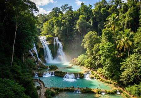 Green Paradise: Kuang Si Waterfall, surrounded by rich green vegetation in Luang Prabang, Laos. A serene and picturesque natural scene.