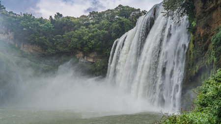 Beautiful tropical waterfall. Streams of water flow down from a sheer cliff into the river. Foam, splashes, fog. Green vegetation on the rock. Clouds in the sky. China. Huangguoshu