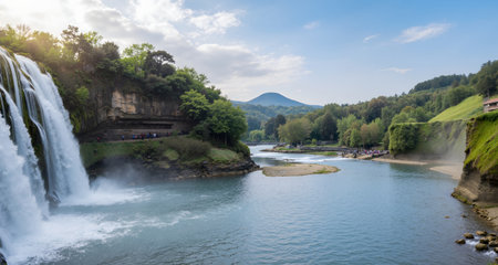 Panoramic view of a waterfall cascading into a clear river, surrounded by lush greenery and blue sky