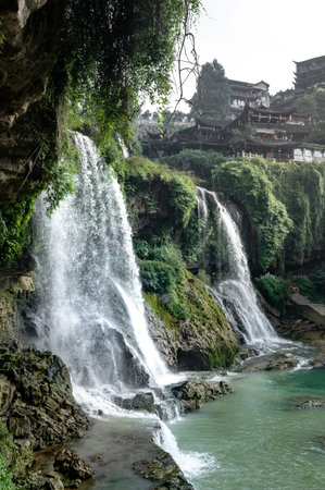 Beautiful waterfall and ancient village at Furongzhen or Furong ancient town in Hunan, China.