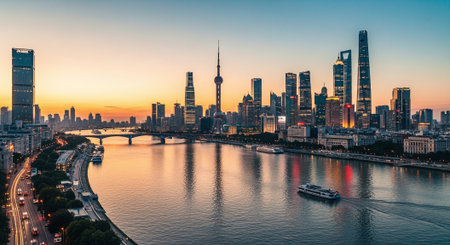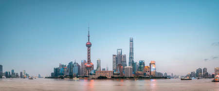 shanghai skyline panorama in sunset, pudong financial center with huangpu river, China