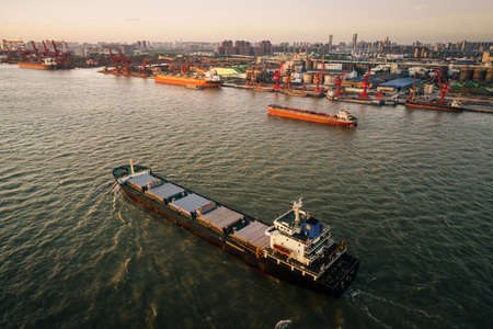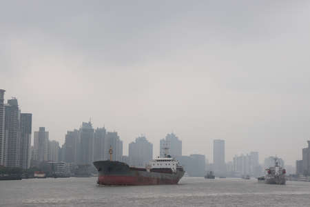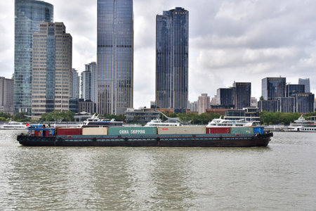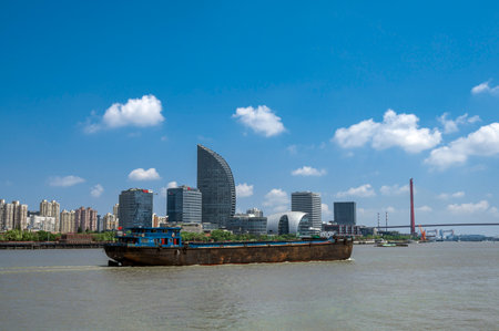cargo ship sailing in huangpu river, a spectacular view of shanghai scenery